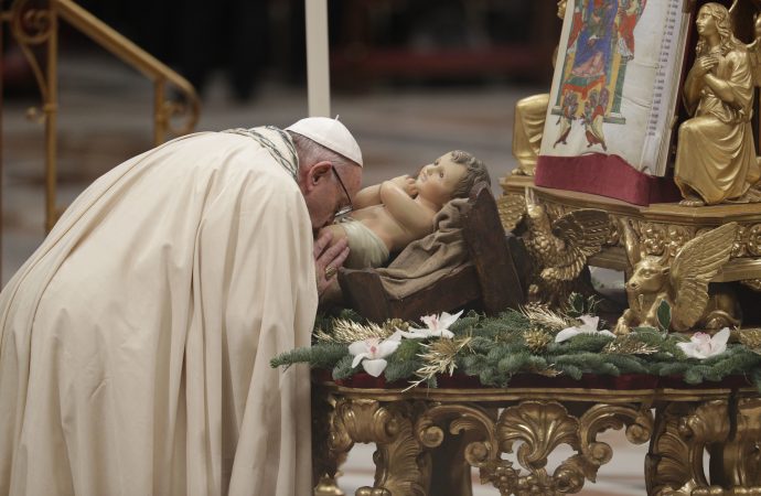 Pope Francis kisses a statue of the Divine Infant as he celebrates a new year’s eve vespers service in St. Peter’s Basilica at the Vatican, Sunday, Dec. 31, 2017. (Credit: AP Photo/Andrew Medichini.)
