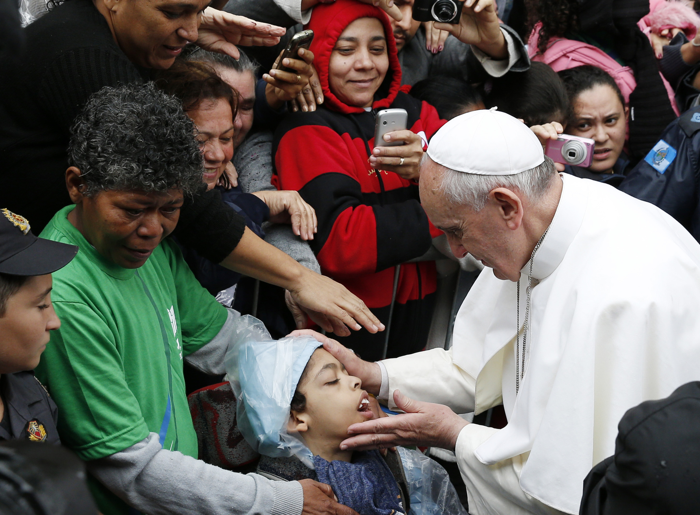 Pope Francis blesses boy during visit to slum complex in Brazil