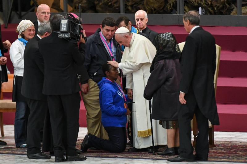 Pope Francis blesses a pilgrim during a special audience with homeless people in Paul VI hall at the Vatican, Nov.11. (CNS photo/Alessandro Di Meo, EPA) See POPE-JUBILEE-HOMELESS Nov. 11, 2016.