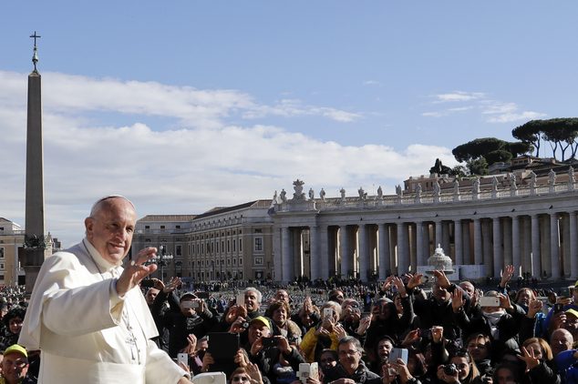 Pope Francis waves to faithful as he leaves at the end of a Jubilee audience in St. Peter’s Square, at the Vatican, Saturday, Nov. 12, 2016. (AP Photo/Gregorio Borgia)